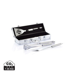 Zestaw akcesoriów do grilla ze stali nierdzewnej, 3 el., w komplecie: szpatułka, widelec z pokrywami ochronnymi i parą szczypiec, rączki ze stali nierdzewnej, w aluminiowym pudełku z uchwytem, ślad węglowy produktu: 7,55 kg CO2