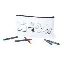 Piórnik zaprojektowany do kolorowania, posiada 5 kredek świecowych w różnych kolorach w komplecie, produkt wykonany z materiału non-woven