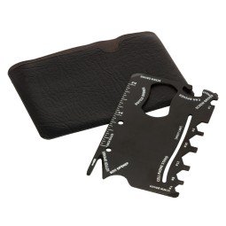 Narzędzie wielofunkcyjne w etui, posiada 9 funkcji: linijka (5 cm / 2 cale), mini wkrętak, otwieracz do kartonu, 2x wkrętak, klucze płaskie (#2, #4, #6, #8, #10, #12), podstawka pod telefon (karta nie jest dołączona), otwieracz do puszek, otwieracz do butelek, produkt wykonany ze stali nierdzewnej