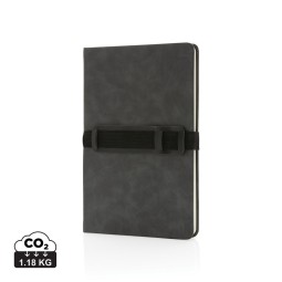 Notatnik A5 (80 kremowych kartek 70 g/m2 w linie), twarda okładka, na okładce specjalna opaska na telefon i długopis, ślad węglowy produktu: 1,18 kg CO2